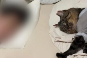 しかし、飼い主さんが近づくとココくんは急に「別に仲良くなんてしてないニャ」と言わんばかりの表情に。そんなココくんの不愛想なふりを気にする様子もなく、娘猫はココくんのお腹に顔を埋めて甘え続けます。ココくんの「ツン」と娘猫の「デレ」の絶妙なバランスに、思わず笑みがこぼれてしまいますね。