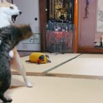 時にはあいちゃんに少し驚かされて「ビクッ」としてしまう場面もありますが、それでも茶々ちゃんの情熱は止まりません。あいちゃんが隠れたダンボールの影から、そーっと様子を伺ったり、尻尾の動きに興味津々だったりと、その一挙手一投足がまさに天使!