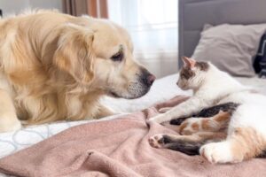 並んで仲良く離乳食を食べる子猫たち。そこへ、大きなパパ猫がやってきて、一匹の子猫のお皿に顔を突っ込んでしまいました。自分のごはんを奪われた子猫は、小さな体で一生懸命に抗議!「それは私のごはんなの!」と言わんばかりの可愛らしい鳴き声で、パパ猫に訴えかけます。