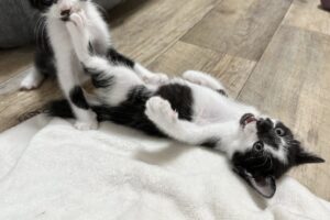 ソファ(床)でゴロン…と思ったら、そのままスッとひっくり返って“へそ天”になっちゃう子猫たち。