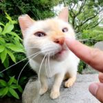 堤防沿いの道端にふと腰を下ろすと、遠くからトコトコと茶トラ猫さんがやってきました。人懐っこいその子は、ためらうことなくスッと膝の上へ。心地よい重みと温かさに癒やされていると、さらに別の猫さんたちも「僕も!」「私も!」と集まってきます。