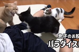 かわいいあくびで爽やかな目覚めですね。今度は夜になると別の猫さんが赤ちゃんに添い寝をしています。朝も夜も優秀なシッターさんと一緒に安眠できる赤ちゃんは幸せです。