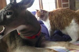ハンサムボーイのキジ白の子猫がミーミーと可愛い声で鳴きながら飼い主さんの足元をうろちょろしていますが、次の瞬間には足元から一気に飼い主さんの足をかけ登ってきました。