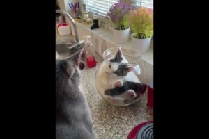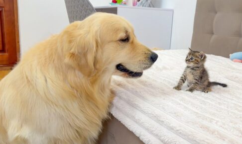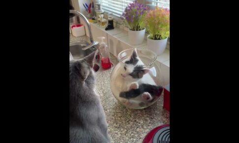 ひよこたちは猫をお母さんと勘違いしているようです。その様子を見たお母さん鶏もはてなマークいっぱいで首を傾げています。なんともほのぼのとした光景です。