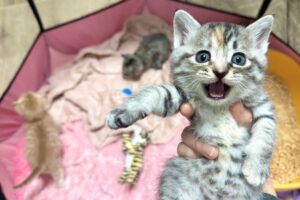 飼い主さんとおもちゃの引っ張り合いっこをしているお姉さん猫の顔は真剣そのもの。子猫はお姉さん猫のあまりの豹変ぶりにかなりビックリしています。