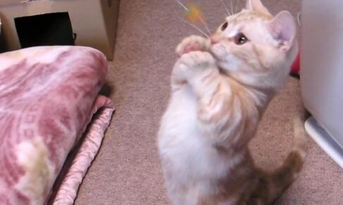 お目々をクリクリさせながらじゃらしの動きに合わせてしっかり体勢を変えながらサッと立ち上がって猫パンチの連打を繰り返して遊ぶ姿が微笑しいです。