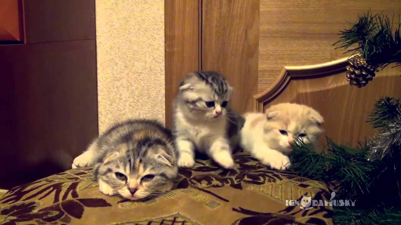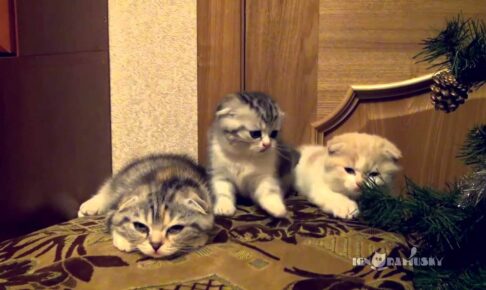 可愛い三つ子のスコティッシュフォールドの子猫たちがカーペットの上でぴったりくっついてくつろいでいます。すると飼い主さんの大きなあくびの声が響いてきました。