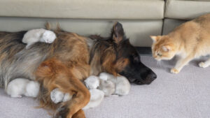 仲良しなシェパードが子育ての手伝いをしてくれるのでママ猫もハッピー