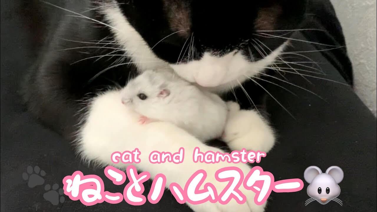 ハチワレ猫さんが自分よりもずっと小さなハムスターを慈しむように頭を舐めてあげています。本来なら猫さんにとってはハムスターは狩猟の対象になる動物です。