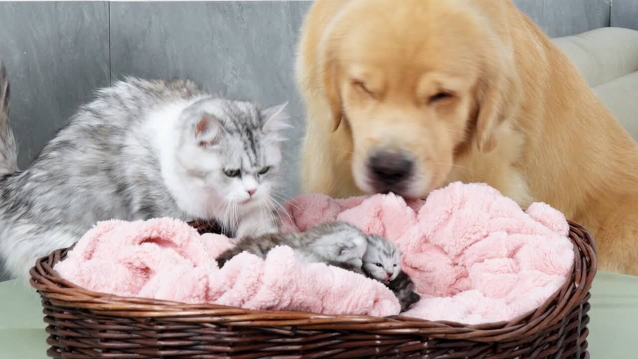 主人公は、優しく子育てをするお母さん猫と、その赤ちゃん。そして、家族同然に暮らすゴールデン・レトリバーです。動画は、一匹の生まれたての子猫が、何らかの理由で鳴き止まず、お母さん猫が困り果てている瞬間を捉えています。