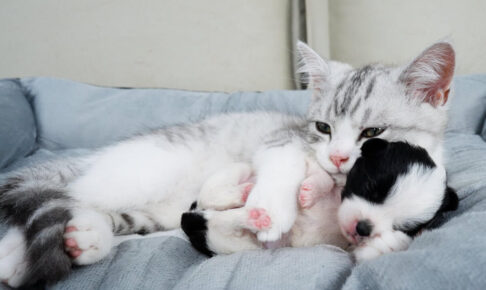 子猫ちゃんは、怯える子犬に優しくスリスリと寄り添い、小さな身体で温もりを与えようとします。まるで「もう泣かなくていいよ」「私がそばにいるから大丈夫」とでも語りかけているかのような、その健気で愛らしい姿に、見ている誰もが心を打たれてしまいます。