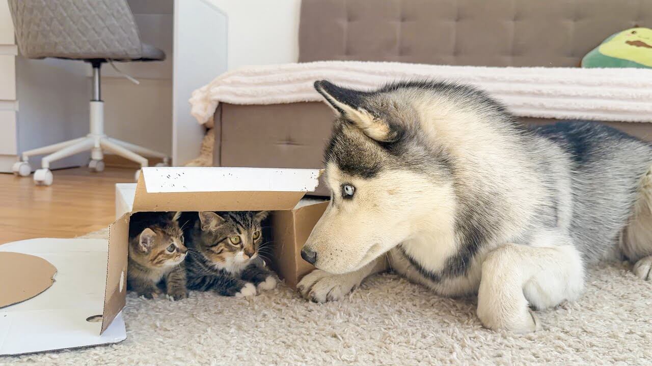 【子猫を奪え!】巨大なハスキー犬が「子猫入りダンボール」を強奪!? その優しい行動に感動!