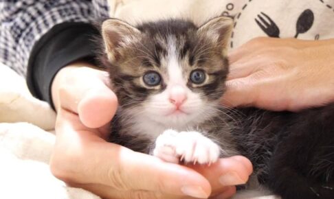 子猫たちは、床で遊んでいたはずが、保護主さんの膝が空いていることに気づくと、「ここが一番安全ニャ!」とばかりに、小さな身体を一生懸命動かして登り始めます。