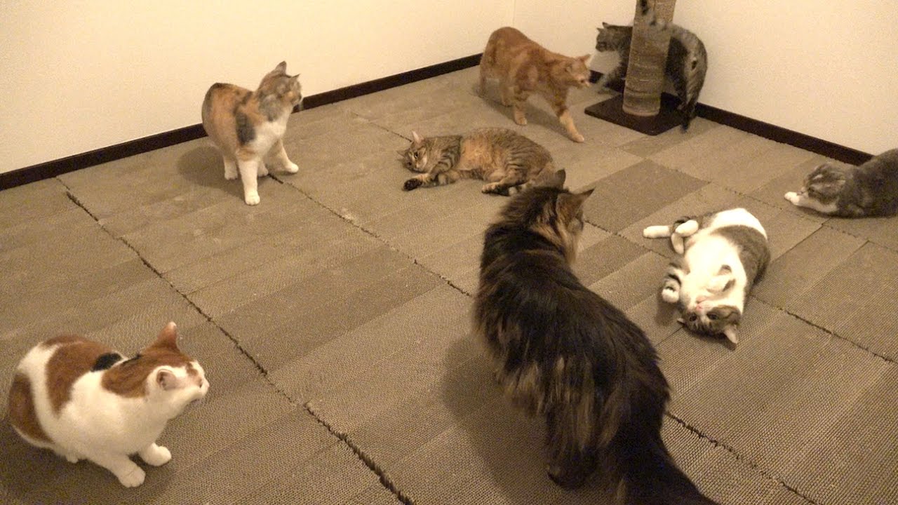 この部屋は、猫たちにとって最高の遊び場であり、ストレス発散の場所!動画には、複数の個性豊かな猫たちが、所狭しと並べられた爪とぎや、ユニークな猫グッズを使って自由に過ごす様子が映し出されています。