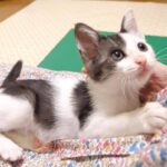 一方、子猫のほうも、小さな身体で精一杯、威嚇したり、好奇心から手を伸ばしたりと、懸命に対応しています。この微笑ましい初接触からは、種族を超えた友情がこれから芽生える予感がひしひしと伝わってきます。