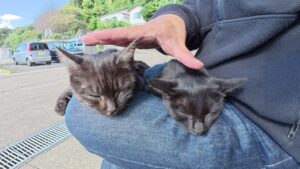 【膝の上は天国!】マーブル黒猫とチビ黒猫を同時モフ!究極の「猫重」に心がとろける!