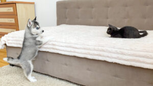 【癒し】初対面で猫パンチの洗礼!それでもめげないハスキー子犬と子猫の距離が縮まる瞬間に胸キュン!