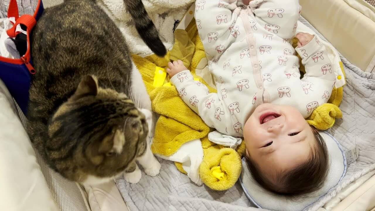 動画の主役は、まだ小さな赤ちゃんと、元保護猫の「キウイ」くん。 二人はベビーベッドの上で仲良く並んでくつろいでいます。 しばらくしてキウイくんが立ち上がり、赤ちゃんの顔を覗き込むように見つめると… なんと赤ちゃんは、まるで花が咲いたような満面の笑みに!