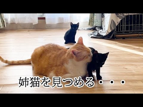 動画のタイトル通り、弟猫ちゃんは先住猫さんのことが気になって仕方がない様子。少し離れた場所からじーっと見つめたり、そろそろと忍び足で近づいては、ビクッとして後ずさり…。