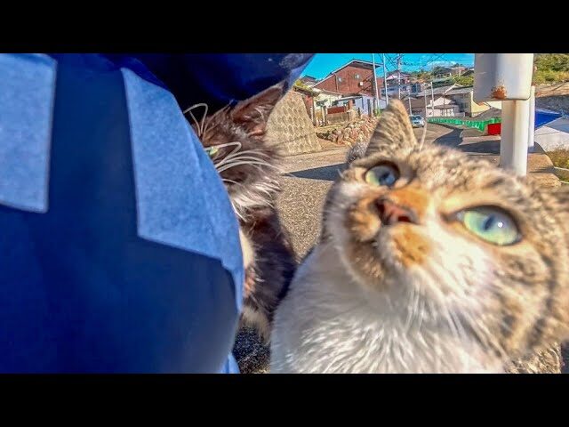 「ここは通さニャイ!」猫の関所に捕まった!長毛の黒白猫がポケットの中身を真剣チェック