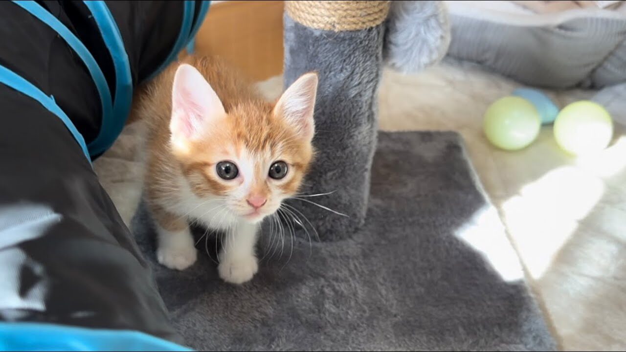 動画の主役は、生後2か月になったばかりの「ちゃちゃまる」くん。一般的に、新しいお家に来たばかりの子猫は緊張して隅に隠れてしまうことが多いものですが、ちゃちゃまるくんは違いました。