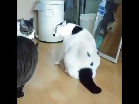 動画の主役は、今まさに一触即発のムードが漂う2匹の猫ちゃん。お互いに身を乗り出し、激しい猫パンチの応酬が始まろうとしたその時です。背後から「まあまあ、落ち着きなさいニャ」と言わんばかりに、1匹のふっくらとした猫ちゃんが登場しました。
