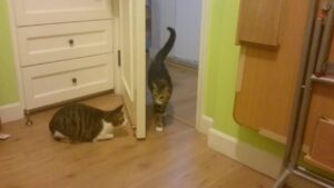 【爆笑】「そこから来るの分かってたニャ!」ドアの影で身を潜める猫ちゃん……。飼い主さんへの“全力アンブッシュ”が鮮やかすぎて吹くw