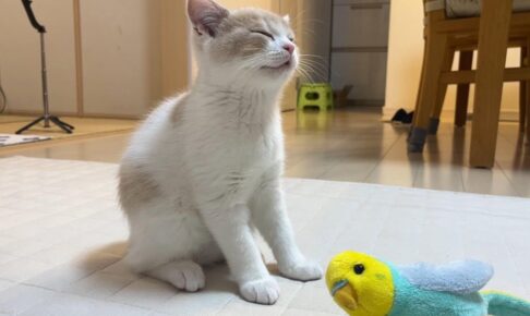 動画の冒頭、息子くんのすぐ隣でじっと座って待つわたくん。 「まだかなぁ」「早く終わらないかニャ……」と言わんばかりの切ない表情で息子くんを見つめています。宿題を邪魔するわけでもなく、ただ静かに隣に寄り添う姿に、わたくんの健気な愛情が伝わってきます。
