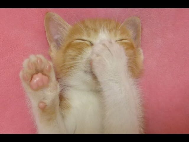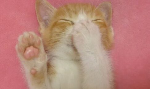 今回の主役は、生後間もない保護猫の「ルゥちゃん」。 ピンク色のブランケットの上で、仰向けになって「ヘソ天」ポーズで爆睡中なのですが、その姿が何とも独特なんです。