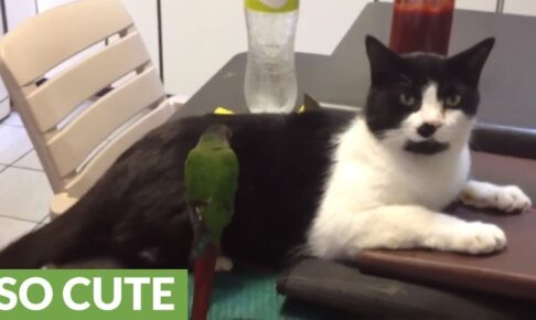 今回の主役は、猫のフェリックスくん。なんと、小さなペットの小鳥さんに「毛づくろい(グルーミング)」をしてもらっている真っ最中なんです。