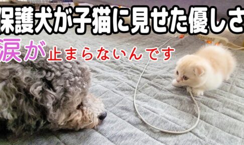 特に大きな体のハスキー犬・はす君が、子猫に合わせて姿勢を低くする姿には、飼い主さんならずとも「なんて優しいの……」と感動を禁じ得ません。 一方の元保護犬・きゅうちゃんも、新入りの小さな家族を優しく受け入れている様子。