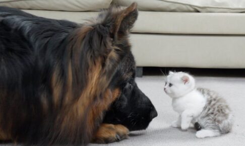 普通なら、自分より何倍も大きなワンちゃんに驚いてしまいそうなものですが、シェパードが見せた反応は驚くほど穏やかなものでした。まるで「大丈夫だよ、怖くないからね」と語りかけるように、優しく鼻先を寄せ、子猫の不安を一つひとつ溶かしていくのです。