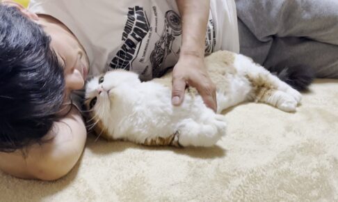 「ここはボクの特等席だニャ!」と言わんばかりに、お父さんの腕枕を独占してリラックスする姿は、まさに天使そのもの。時折見せる、幸せを噛みしめるようなウトウト顔に、見ているこちらの目尻も自然と下がってしまいます。