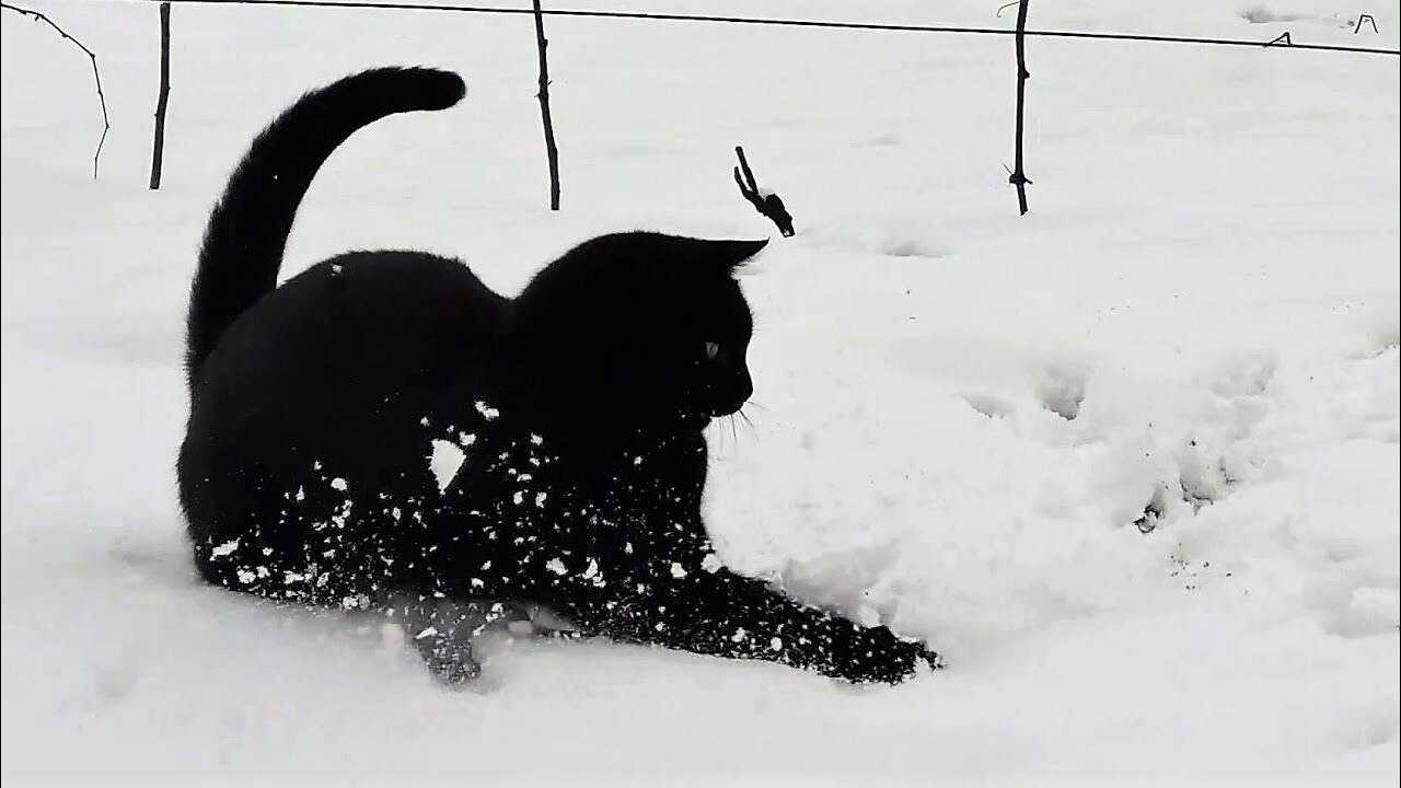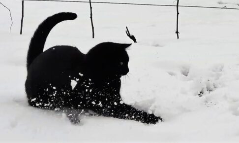 おっかなびっくり外へ踏み出したゲイルくん。足に触れる雪の冷たさに驚いたのか、次の瞬間には「ニャッ!?」と飛び跳ねるような仕草を見せます。しかし、怖がるどころか、フカフカの雪にテンションは最高潮に!