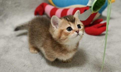 短い手足を精一杯伸ばして、なんとかおもちゃを捕まえようと奮闘するのですが、あと一歩のところで空振り。そのたびに「あれれ?」と首をかしげたり、少し悔しそうな表情を見せたりする姿が、たまらなくキュートなんです。