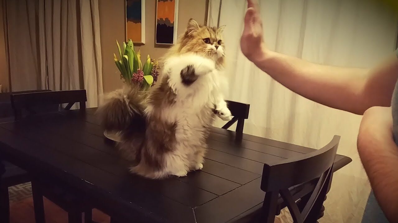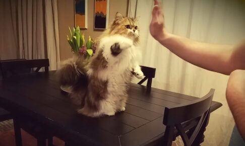 動画が始まると、パパが手をかざして「ハイタッチ!」の合図。するとミロくん、短い足を一生懸命伸ばして、パパの手のひらに「ポンッ」と見事なハイタッチを決めてくれるんです!一度ならず二度、三度と、場所を変えても完璧にこなすその姿は、まるで小さなプロフェッショナルのよう。