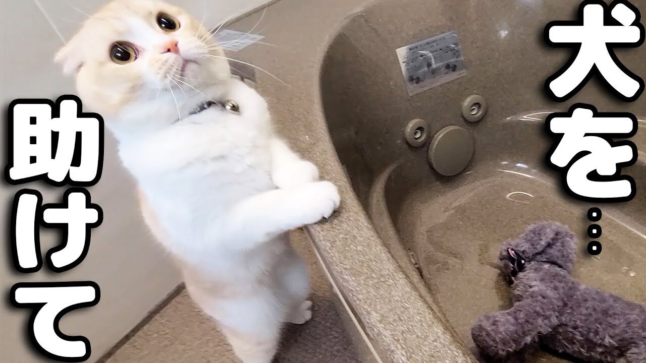 【悶絶】「ワンちゃん、大丈夫かニャ!?」お風呂で“溺れている”と勘違いした猫。必死すぎる救出劇(?)に涙が止まらない!