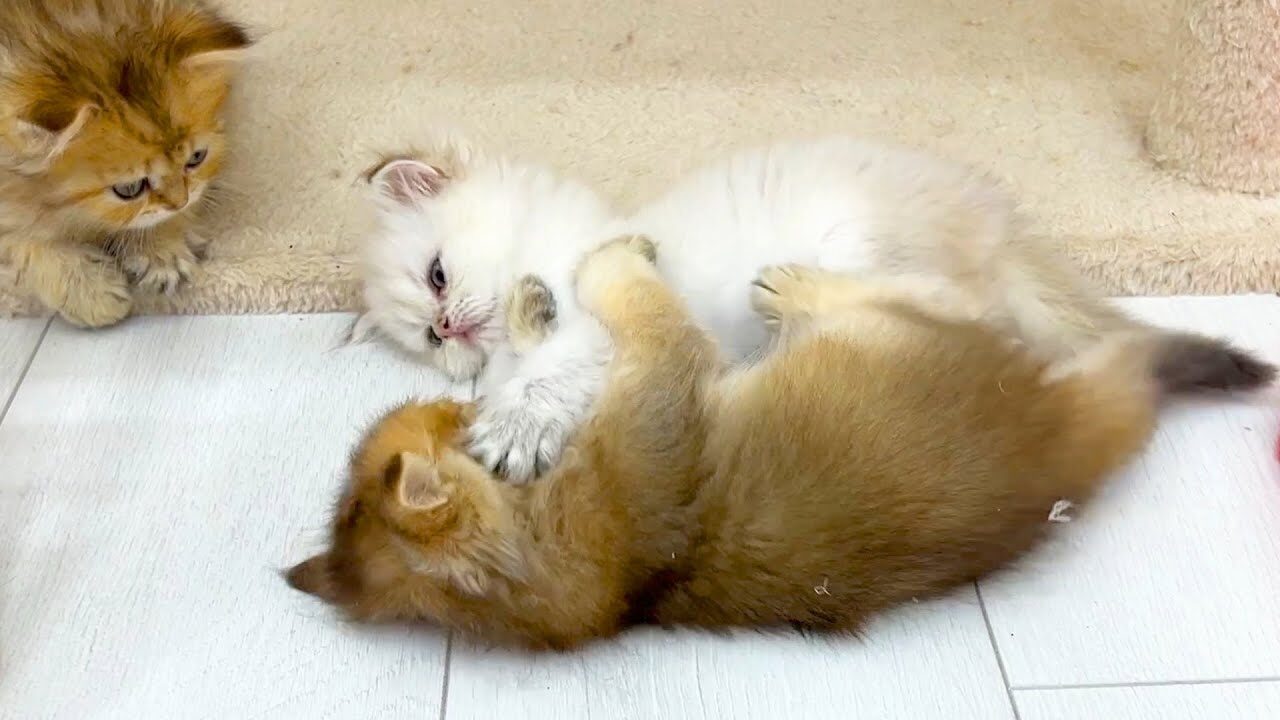 動画が始まってすぐ、白い子猫が茶トラの子猫に先制攻撃! すると、茶トラの子猫も負けじとお腹を見せながら、短い手足で一生懸命に応戦します。 その一進一退(?)の攻防は、見ているだけで口角が上がってしまうほどの愛くるしさです。
