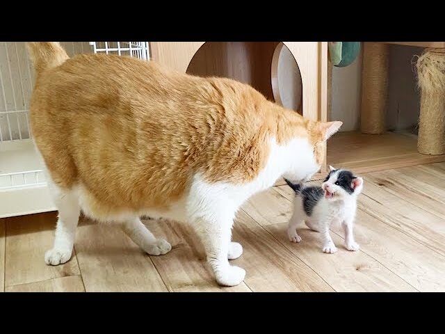 初めて大きな猫を見た赤ちゃん猫
