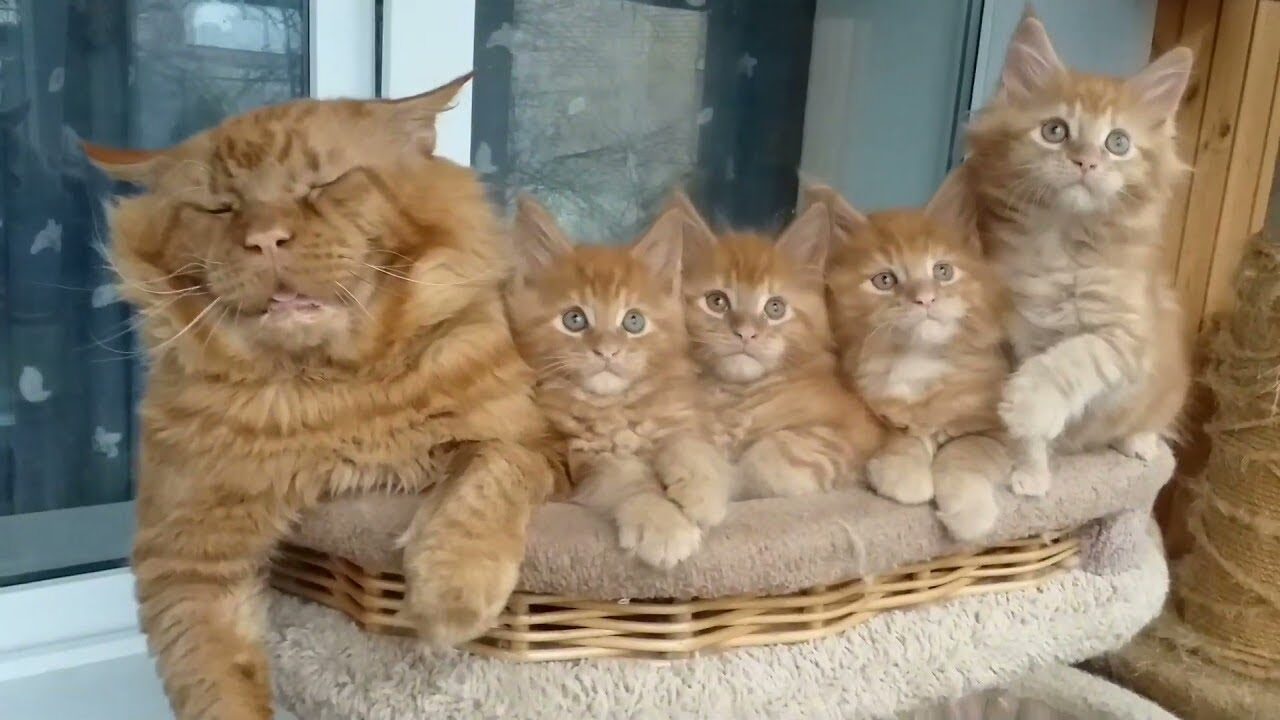 猫好きの皆さん、今日は大家族の心温まる一コマをお届けします。主役は、立派な毛並みが自慢のメインクーンのお父さんと、その血をしっかり引き継いだモフモフの子猫ちゃんたちです。