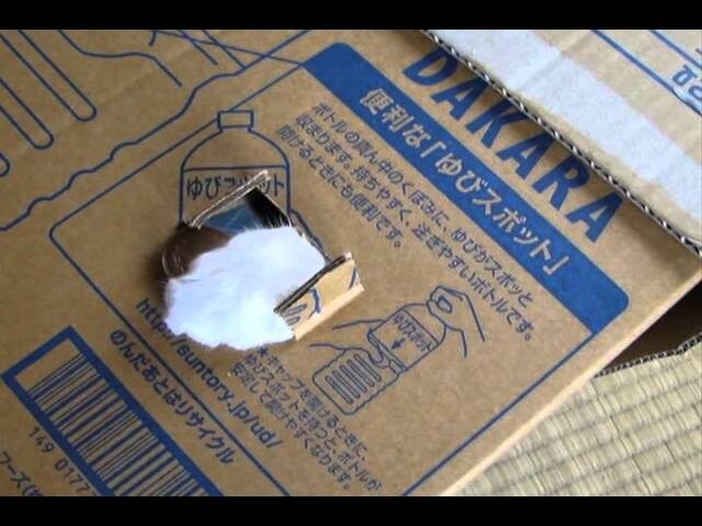動画が始まると、そこには段ボール箱に開けられた小さな穴が。その穴の前に小銭を置くと、中からふわふわの白いおててがニュッと伸びてきて、サッと小銭を箱の中に引き込んでしまいます!