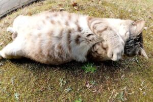 茶シロちゃんが少し遠くまで行きすぎると、ママ猫さんが「こっちにおいで」と言うように迎えに来てくれます。二匹が顔を合わせ、鼻先を寄せて挨拶を交わす姿は、まさに愛情そのもの。ママ猫さんの優しい眼差しからは、我が子を想う深い慈しみを感じずにはいられません。