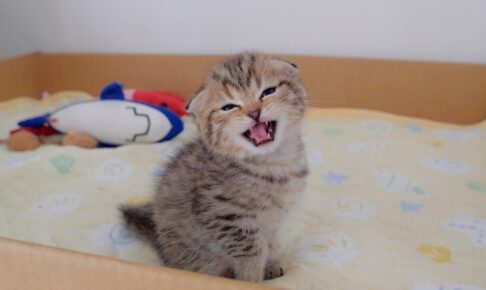動画が始まると、リコちゃんがケージの前にやってきます。子猫たちも、リコちゃんの姿を見つけると興味津々!リナちゃんは自らリコちゃんに近づき、鼻先をちょんと合わせてご挨拶。リサちゃんも、前回の「シャー」が嘘のように落ち着いた表情を見せてくれます。