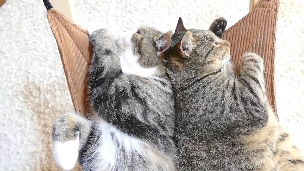 【至福】「ここは天国かニャ?」ハンモックで仲良くスヤスヤ……。まる&はなちゃんのシンクロ寝姿に悶絶!
