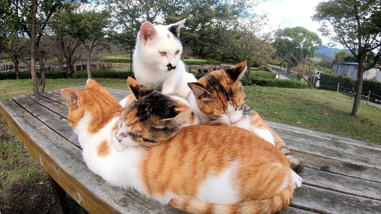 YouTubeチャンネル「野郎が撮った猫動画」からご紹介するのは、公園のベンチで身を寄せ合う猫さまたちの日常です。 この日、一匹の三毛猫さんが少し風邪を引いてしまったようで、元気がありません。