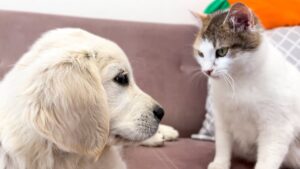 【悶絶】「ねぇ、遊んでニャ!」猫さんたちに全力でアピールするゴールデン・レトリバーの子犬ちゃん。ちょっぴり(?)塩対応な猫さまとの温度差に癒やされる♡