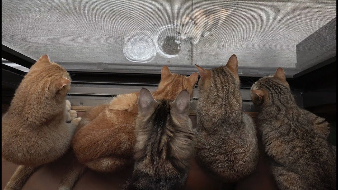 静かな午後、お庭の片隅にひょっこりと姿を現したのは、一匹の小さな野良の子猫さん。すると、家の中からその様子を見守っていた10匹の先住猫さまたちが一斉に窓辺に集結!「新しいお友達かな?」「どこから来たの?」と、みんな身を乗り出して子猫さんに釘付けです。