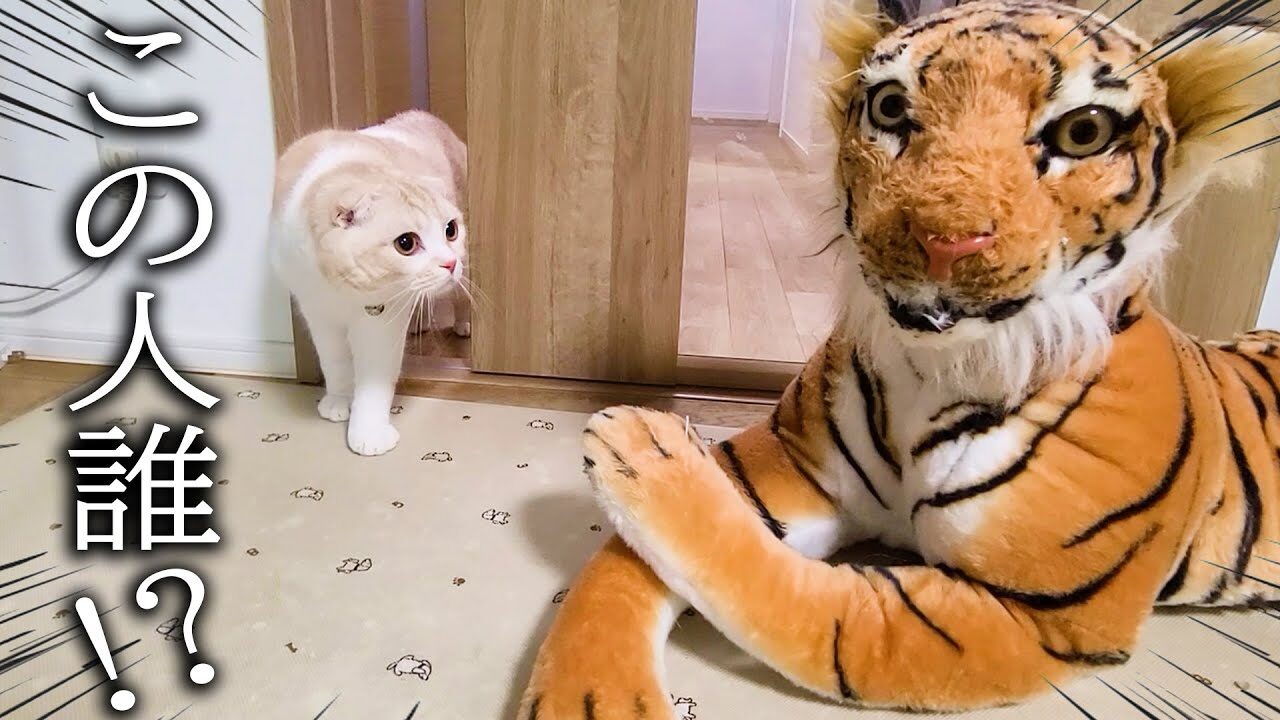 実はこれ、飼い主さんが押し入れから出してきたトラのぬいぐるみ。 あまりの大きさと迫力に、最初は「誰だこの人?」と言わんばかりの表情でフリーズするじゅんちゃんでしたが、勇気を出してそろりそろりと近づいていきます。