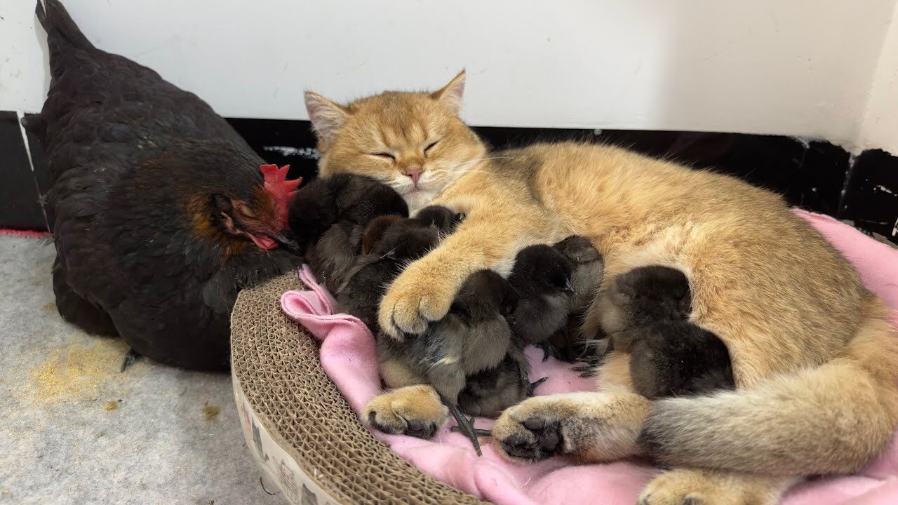 種族を超えた深い愛!ひよこを優しく抱きしめて眠る猫と見守る母鶏の絆に感動