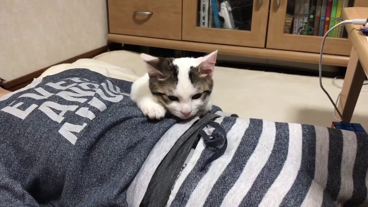 今回の主役は、とっても甘えん坊な豆大福くん。大好きな息子さんが横になっているのを見つけると、吸い寄せられるように背中へトコトコ。そのままおんぶされるような形で、幸せそうにゴロゴロと喉を鳴らしています。